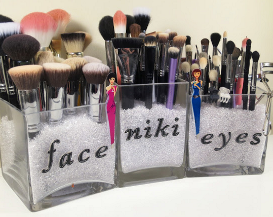 刷子們分類好分別放在收納瓶或收納袋內,刷頭朝上