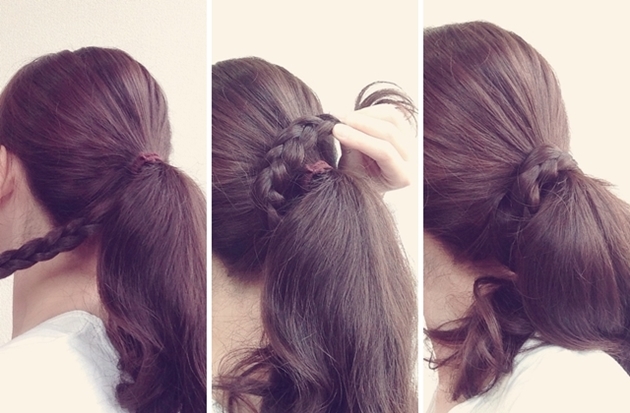 或者你可以考慮將那抓出來的一小束頭髮編成辮子,一樣纏繞在橡皮筋外圍遮住橡皮筋痕跡用夾子固定,辮子儼然代替橡皮筋,成為一種新的編髮造型~