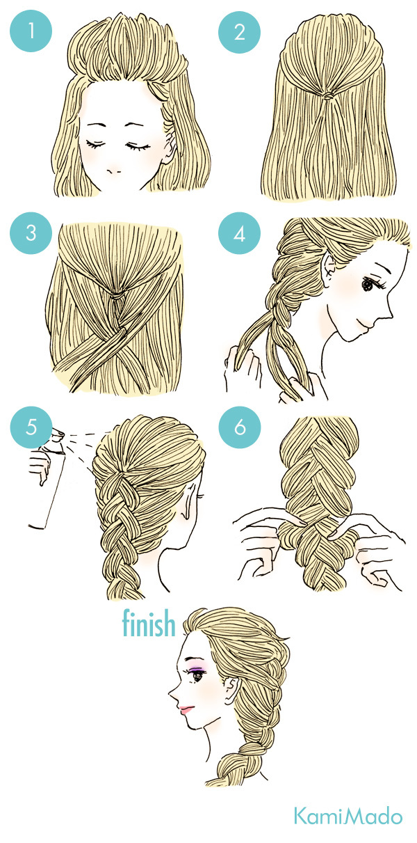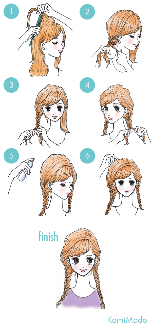 當時爆紅的動畫冰雪奇緣,不可或缺的角色之一安娜的髮型可說是相當有氣質。,在瀏海後先抓出一戳頭髮,從上往下,一邊抓旁邊的頭髮來綁辮子,直到所有頭髮都綁成辮子為止,另一邊比照相同作法。接著噴一點噴霧,抓澎頭頂。