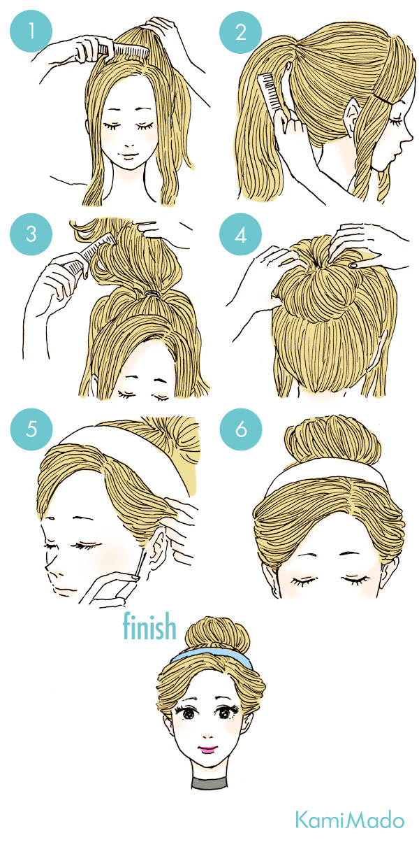 要綁出魅力的灰姑娘公主頭,首先要預留兩戳前面的頭髮並旁分(包括瀏海),暫時用髮夾固定住前面的頭髮後,接著將後面綁成高馬尾,為了梳成球狀,用扁平梳比照米奇頭的方法逆髮順方向梳澎,並將多出來的髮尾用髮夾固定。戴上髮箍,將原先前面的兩戳頭髮用髮夾夾到後面固定,如此一來夢幻般的髮型就完成了!