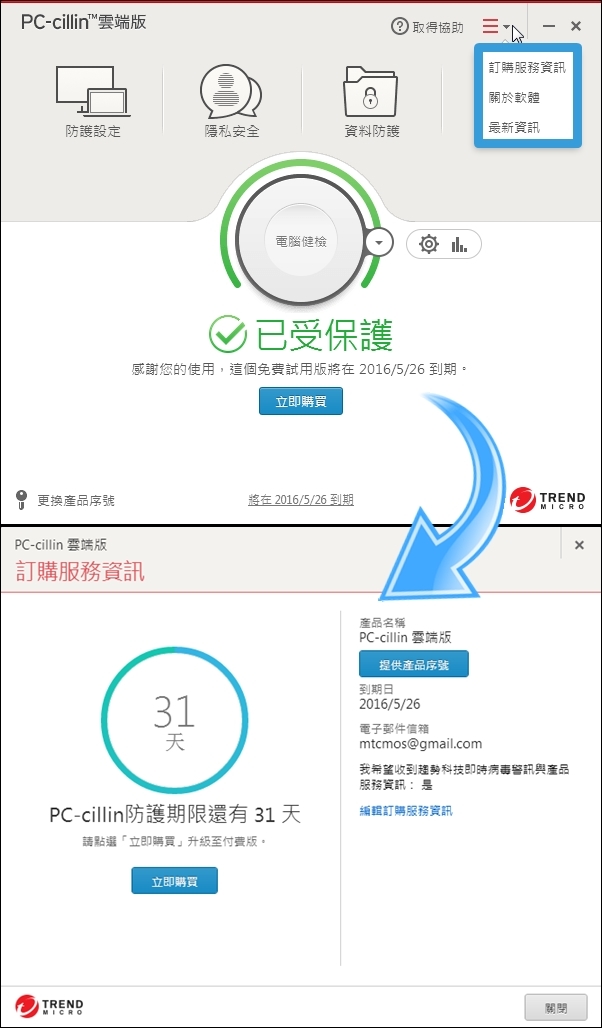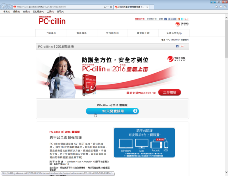【▼】趨勢科技為了讓大家買了PC-cillin 2016雲端版不後悔,所以在官網上面提供了有30天的版本,若覺得用不習慣,30天到直接移除即可,不會像左岸有些軟體還會綁架您的首頁,真的得不償失,新的網址下載:http://www.pccillin.com.tw/30D_downloads.html