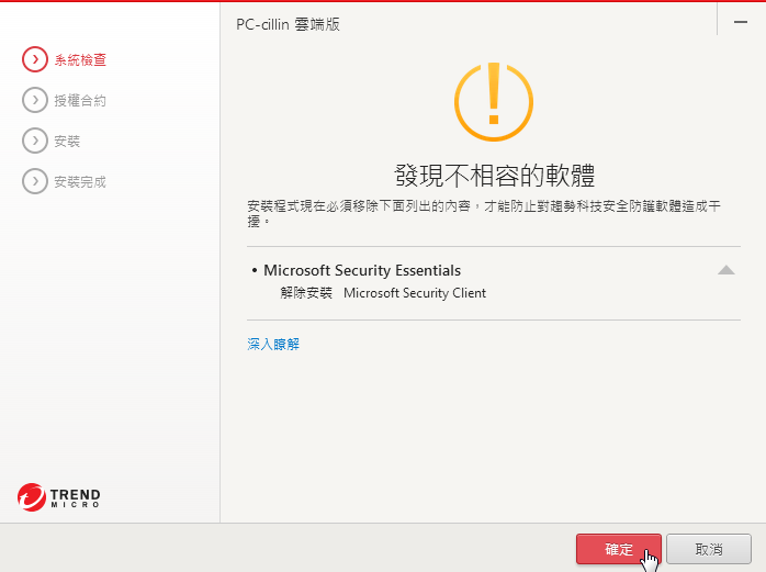 【▼】所以小編先把微軟的MSE給解除安裝,才能繼續安裝PC-cillin 2016雲端版。