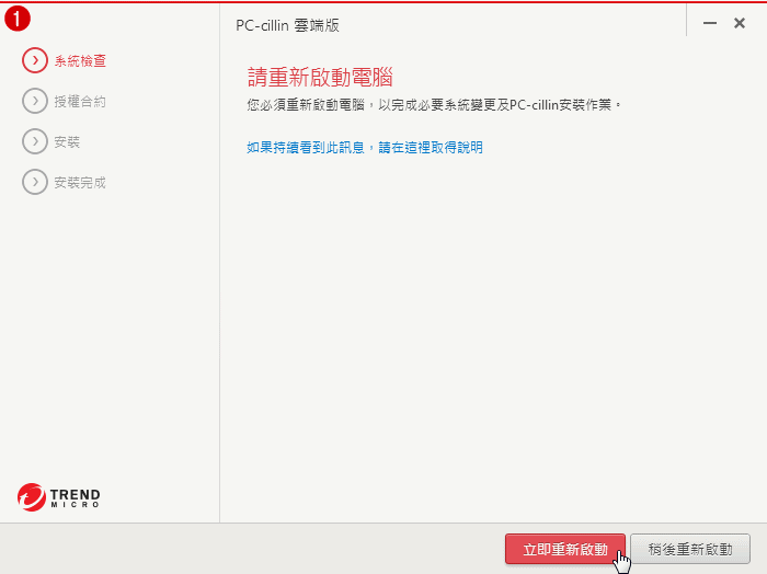 【▼】解除MSE安裝後,會先進行一次重開機,那是為了要讓系統以乾淨的環境作安裝,中間過程包含了同意授權合約等,一般大約5分鐘內可以安裝好。