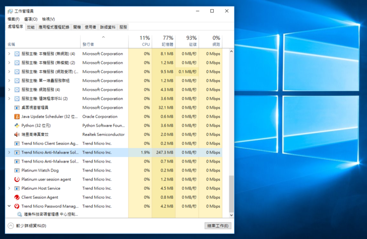【▼】小編在Windows10的環境下,待機時的防護約佔CPU資源1.9%。
