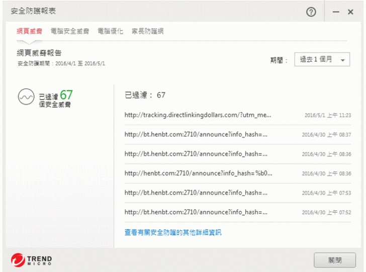 【▼】安全防護報表內的資訊有網頁威脅、電腦安全威脅、電腦優化與家長防護網等頁面,其中電腦優化是主動式的優化動作,能清除電腦不必要的暫存檔、隱私資訊、修復安全漏洞、縮短電腦啟動時間。其餘功能是比較偏被動查詢的相關資訊。