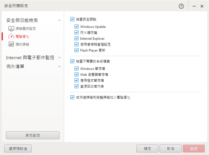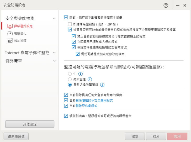 【▼】安全設定中又分安全與效能檢測、Internet與電子郵件監控、例外清單與其他設定,在安全與效能檢測的掃描與喜好設定裡,能針對壓縮檔進行掃描,也可以禁前幾年的AutoRun病毒。