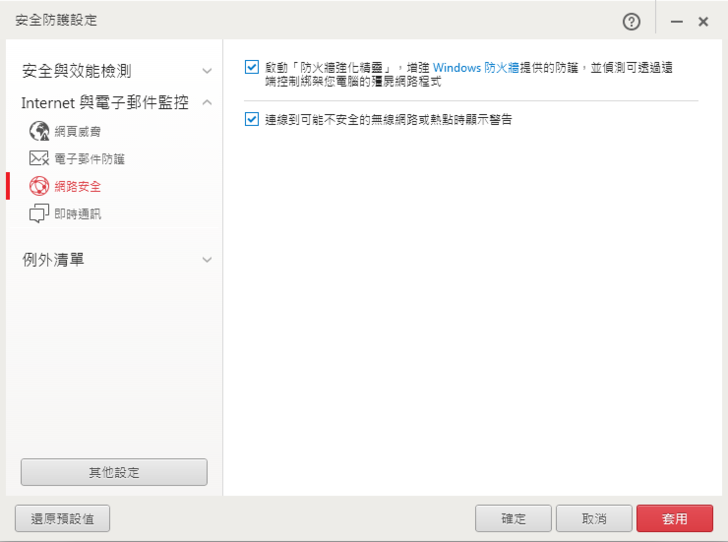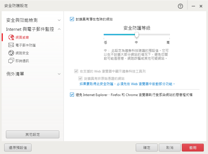 【▼】Internet與電子郵件監控的網頁威脅選項,預設的安全防護等級為中,小編個人認為已經很足夠,若有誤判情形,可依實際狀況調整為低。