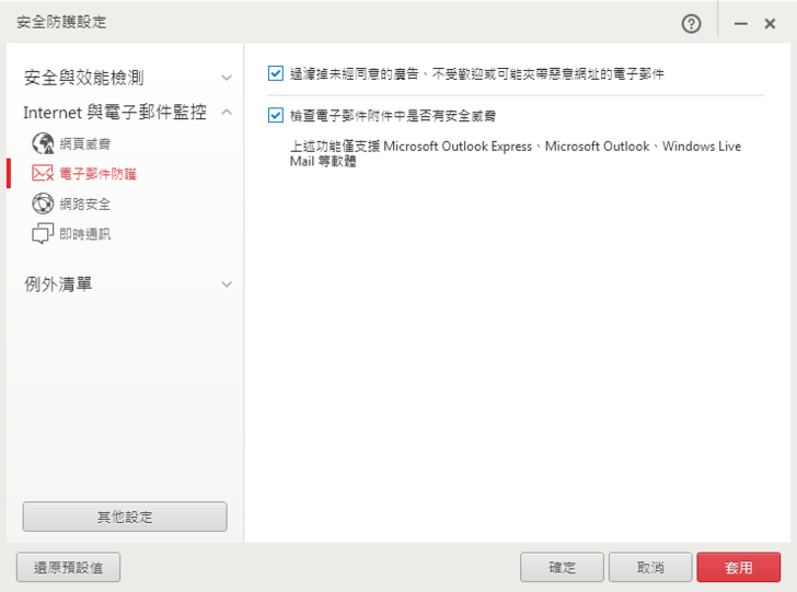 【▼】電子郵件防護選項,這邊全面支援微軟的OE、Outlook與Windows Live Mail,其餘的Gmail、Yahoo等Web Mail,可用轉信方式來防護,不然靠網頁的安全防護也可。