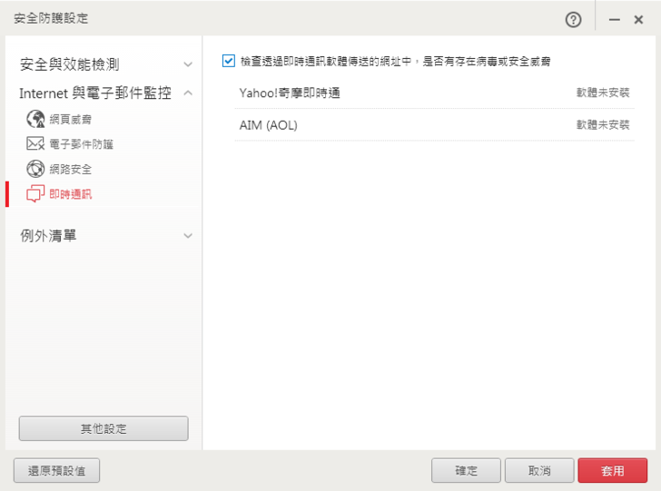 【▼】即時通訊選項,這個部分是比較弱些,因為竟沒有把大家常用的 Line、Skype與FB給納進來,只列了Yahoo!奇摩即時通與AIM(AOL)是略嫌可惜了些。