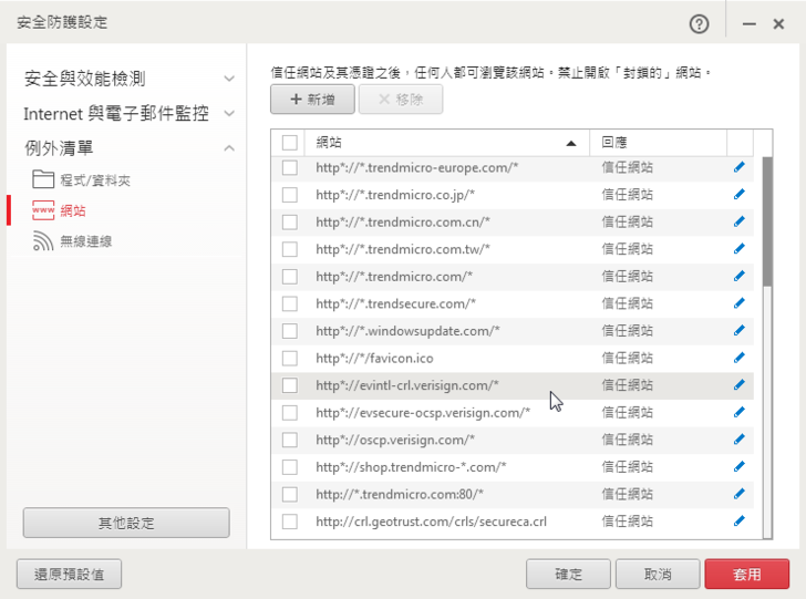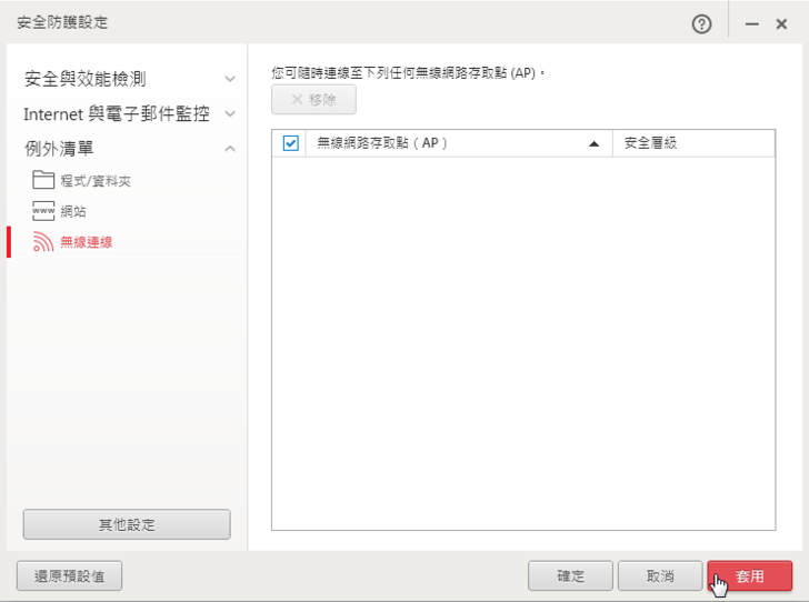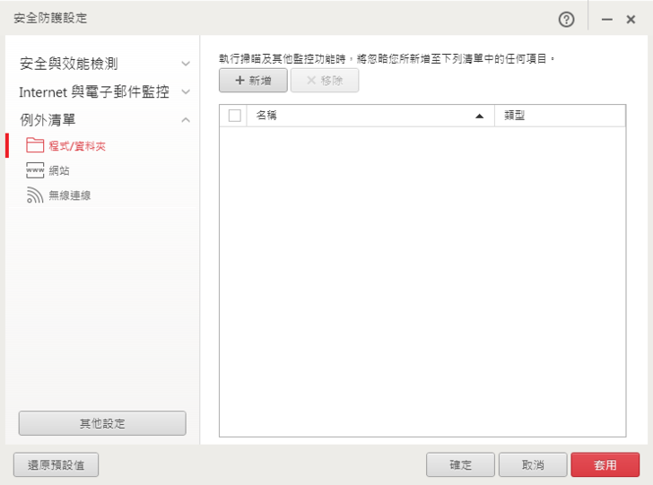 【▼】例外清單中能針對程式/資料夾、網站與無線網路進行有條件的開放。