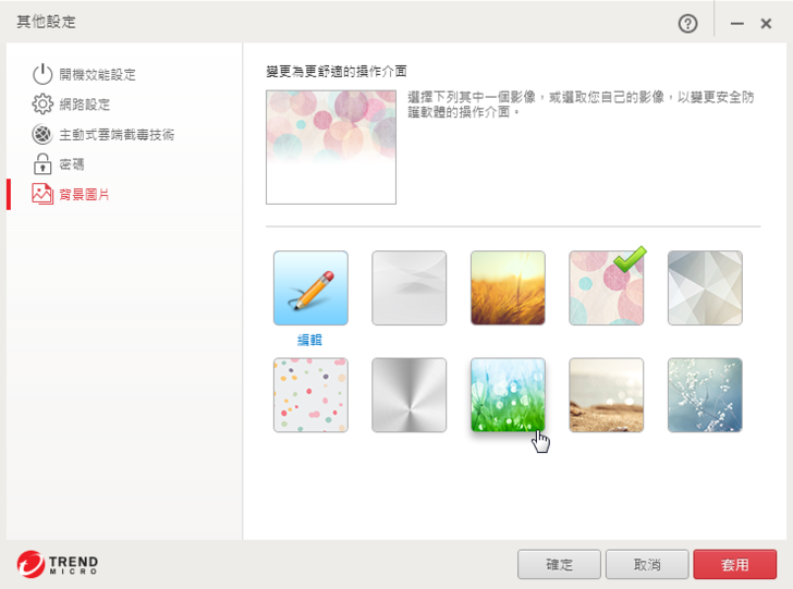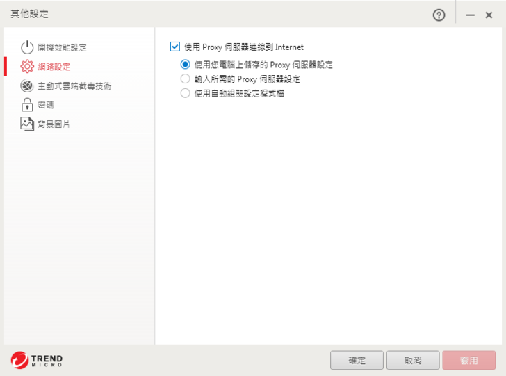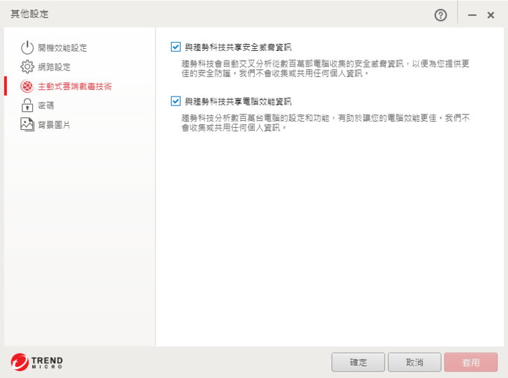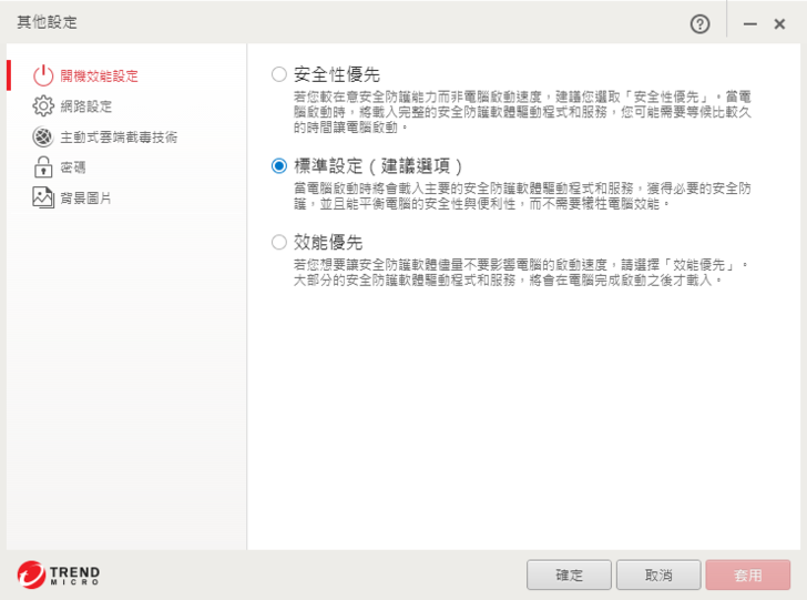 【▼】最後的其他設定中,能設定的有開機效能測試、網路設定、主動式雲端截毒技術、密碼與背景圖片。開機效能測試中,分成安全優先、標準設定與效能優先,建議是選擇標準設定,因為怕說選了效能優先,防軟軟體較慢啟動,有一些開機就會執行的蠕蟲會沒辦法攔截到。