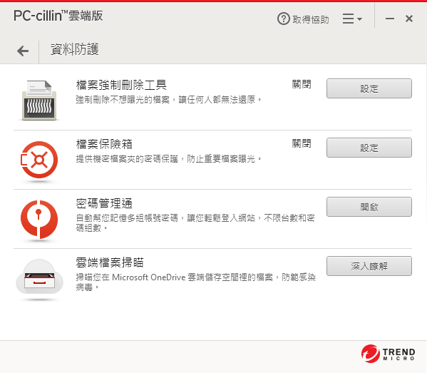 【▼】資料防護部分,提供了有檔案強制刪除工具、檔案保險箱、密碼管理通與雲端檔案掃描四大功能。