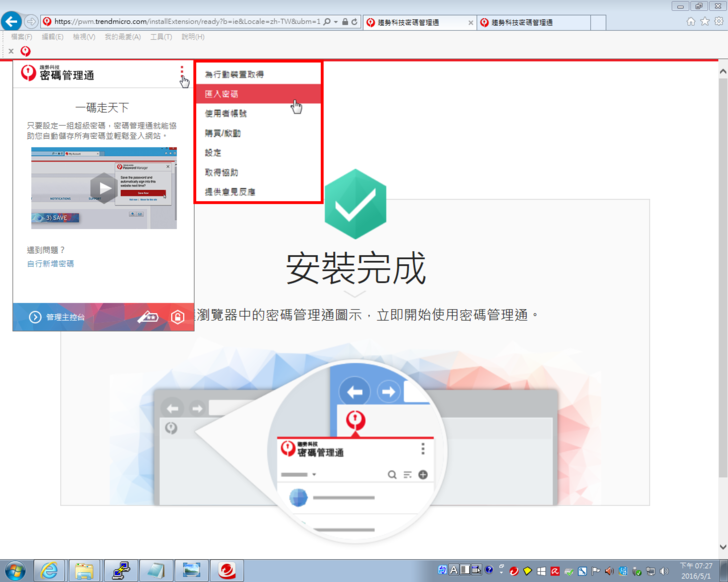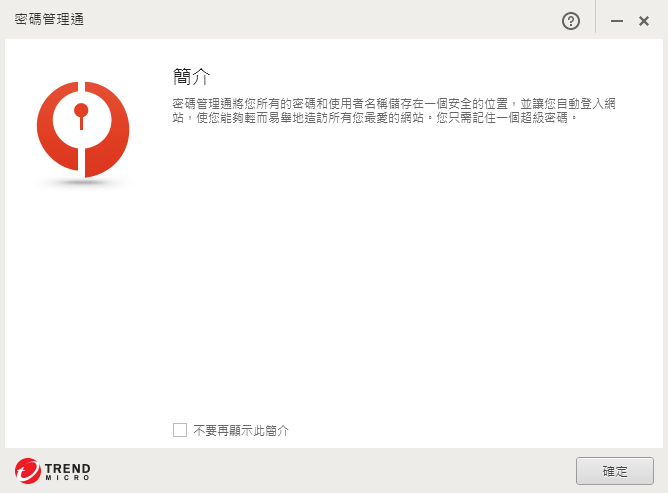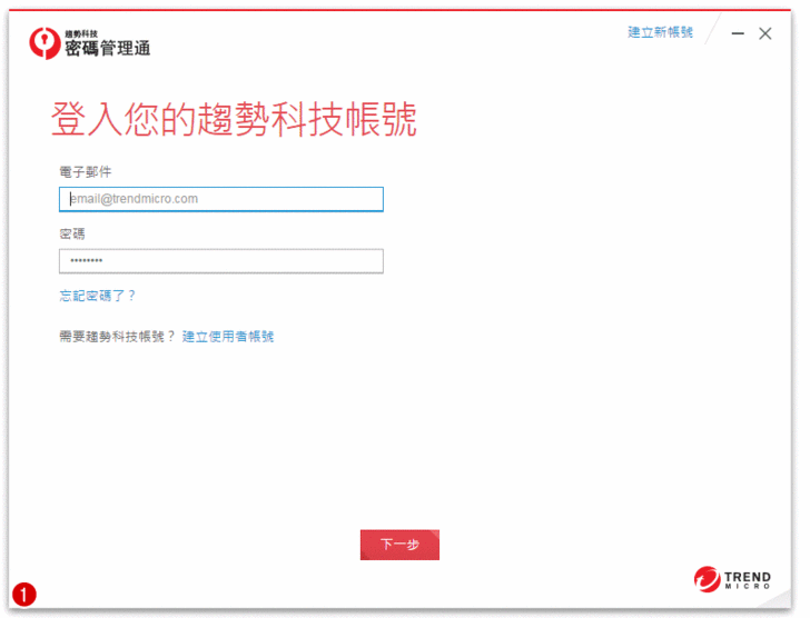 【▼】密碼管理通的服務需先登入趨勢科技的帳號,然後輸入您的超級密碼,最後再安裝密碼管理通瀏覽器擴充套件來完成。