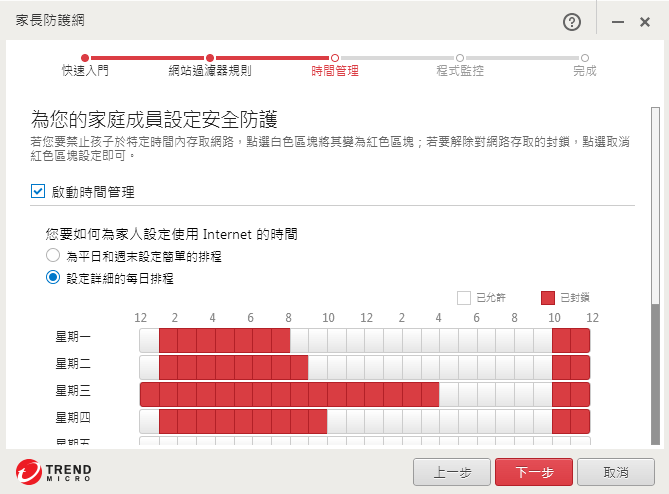 【▼】在時間的管理上,可自由設定星期一到星期日24小時的使用時間,這邊只是針對上網作控制,若玩單機遊戲的話,恐怕也無法作控制。
