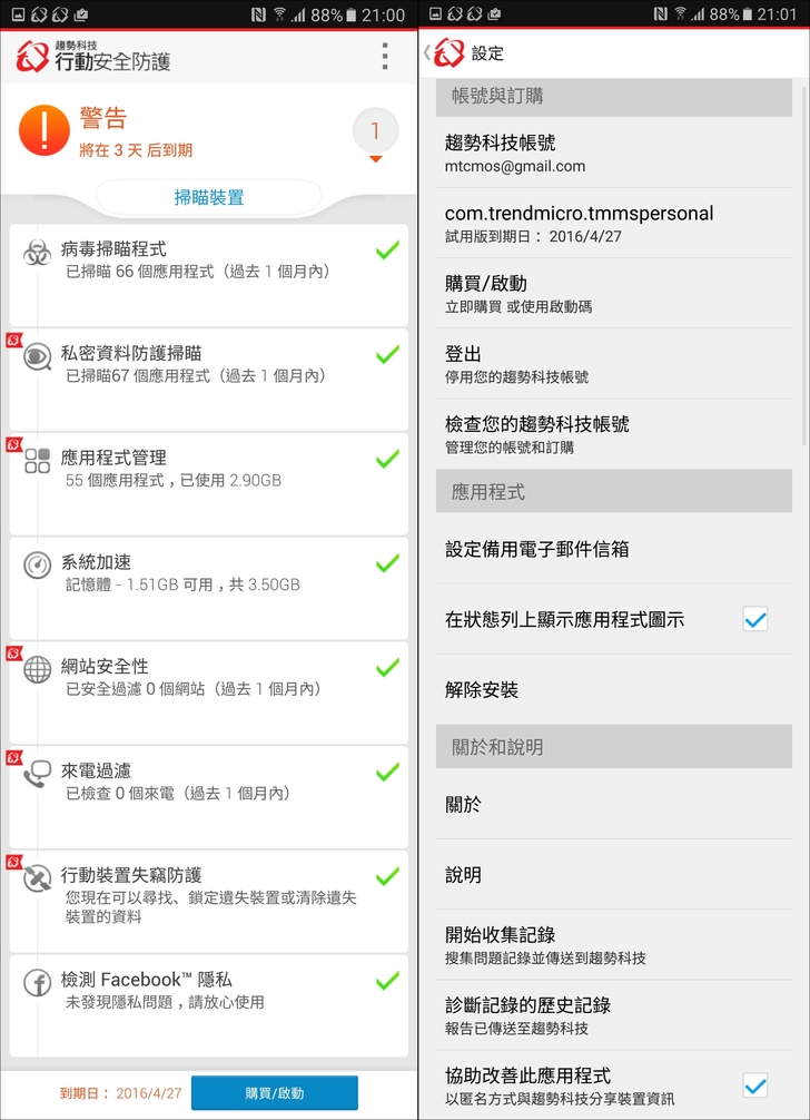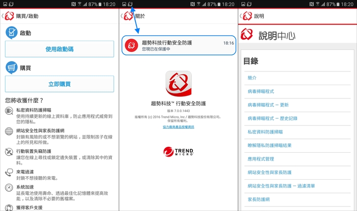 【▼】安裝完行動安全防護的App後,在行動裝置的狀態列上會出現一個常駐的符號,代表趨勢科技行動安全正在防護中,而在設定的頁面中,還有相關功能的電子書說明,若30天試用期滿,可以購買啟動碼,能使用所有的功能不設限。