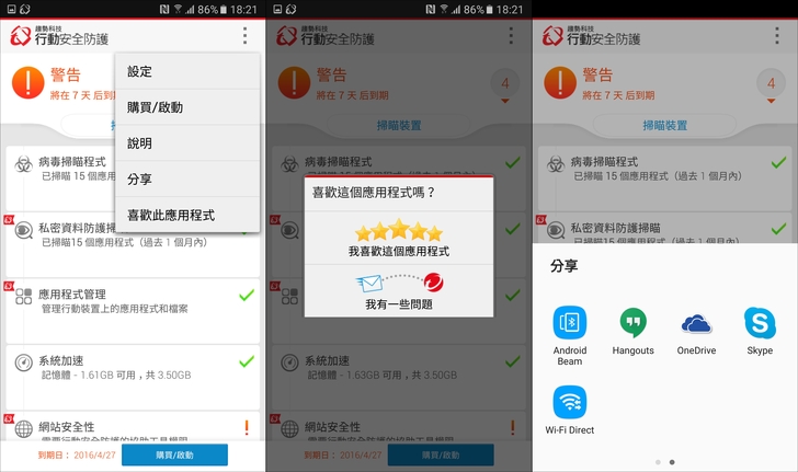 【▼】若覺得行動安全防護的App不錯的話,也可以進行評價與分享的功能,目前Google Play市集中的評分約4.5,算是中高等級的評分!