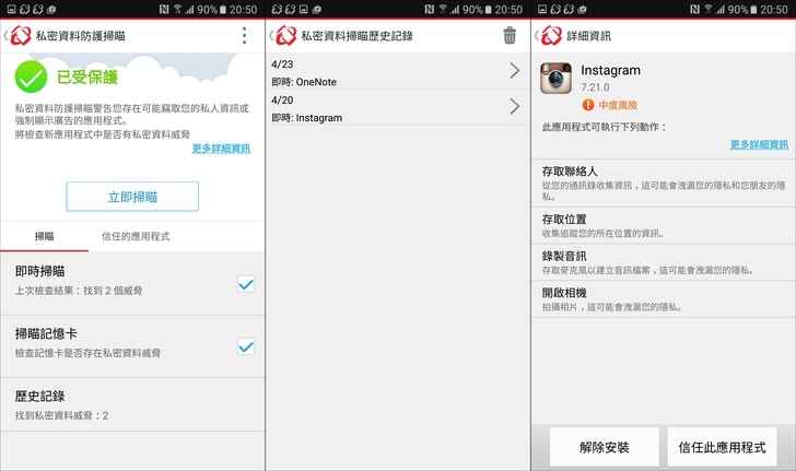 【▼】私密資料的防護功能,這邊會判斷您所安裝的App權限到哪個層級,像IG就會自動存取您的聯絡人與位置,甚至還會開啟相機與錄音,以前安裝錢都不知道,現在知道還蠻驚訝的,當然您認為是合理正常的話,是可以將其歸類於信任此應用程式,若有不知名的App,則還是解除安裝比較保險。