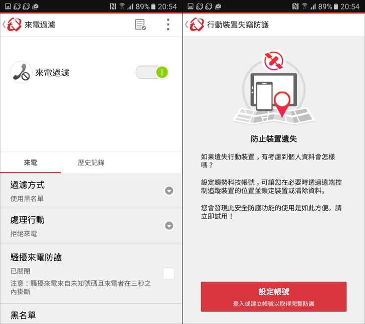 【▼】行動安全防護App中也包含了whoscall的功能,算是相當貼心,只不過資料庫分類還不是很多,很多都要自己加設黑名單才能過濾,這部分相信會越來越棒!而在行動裝置失竊的防護上,能設定趨勢科技帳號來遠端控制追蹤裝置的位置並鎖定或清除資料。