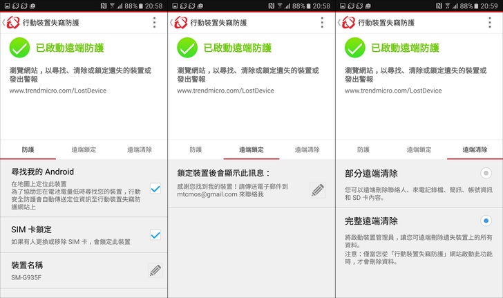 【▼】行動裝置失竊防護功能能鎖定sim卡,鎖定裝置後還能寄信通知到指定的電子郵件上,最後逼不得已還能清除行動裝置上的資料,算是找不回手機置死地而後生的作法了。