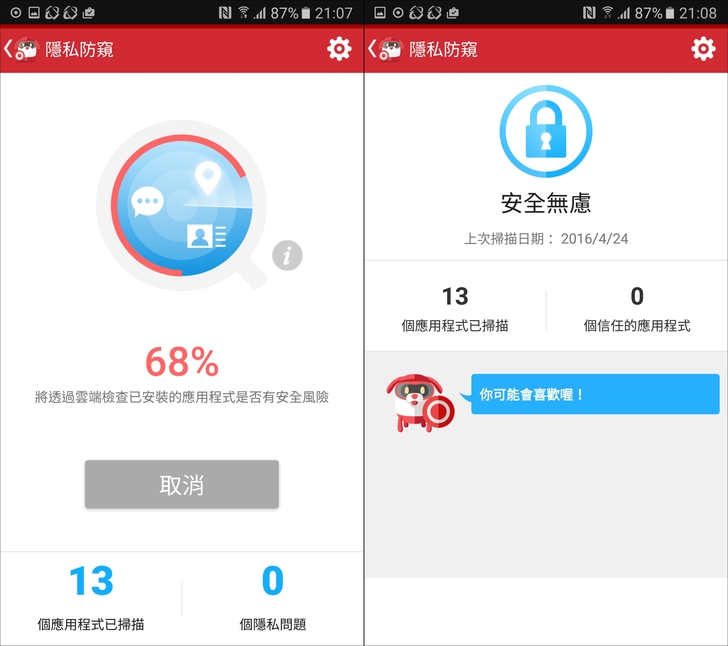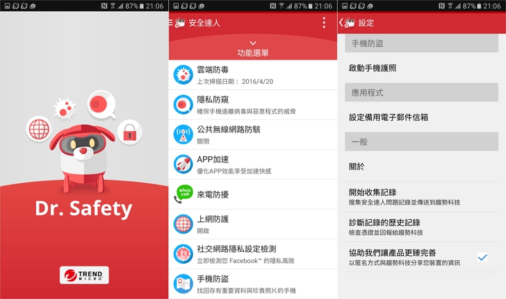 【▼】在介紹完行動安全防護的App後,還有另一套趨勢科技出的App叫安全達人,小編也試用了一下,功能大同小異,也和大家分享一下吧!這個App採用趨勢最強的緝毒犬當作招牌,功能選單上有雲端防毒、隱私防窺、公共無線網路防駭、App加速、來電防擾、上網防護、社交網路隱私設定檢測與手機防盜等。