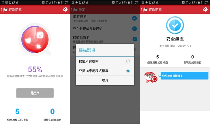 【▼】雲端防毒能針對行動裝置或記憶卡進行掃描,掃描選項能掃描所有檔案或是只掃描應用程式。