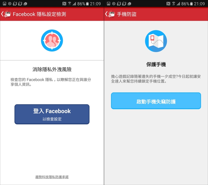 【▼】行動安全防護的主功能表與相關設定,主要有本機病毒掃描、私密資料防護、應用程式管理、系統加速、網站安全、來電過濾、失竊防護與臉書隱私的檢測。