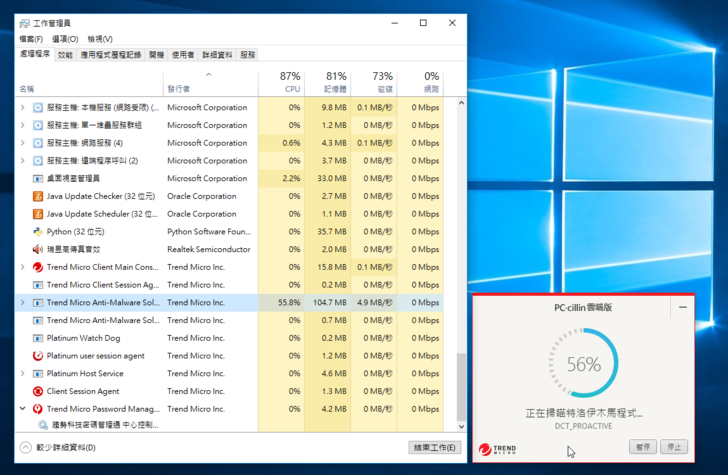 【▼】在Windows10的環境下,執行掃描時的防護約佔CPU資源55.8%。