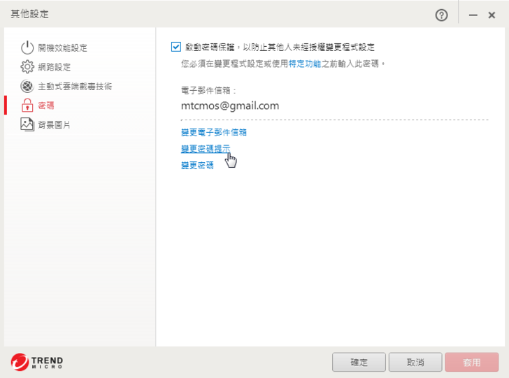 【▼】其他設定中的密碼是針對PC-cillin 2016雲端版內需授權變更的程式作上鎖,避免有心人士亂更改設定。
