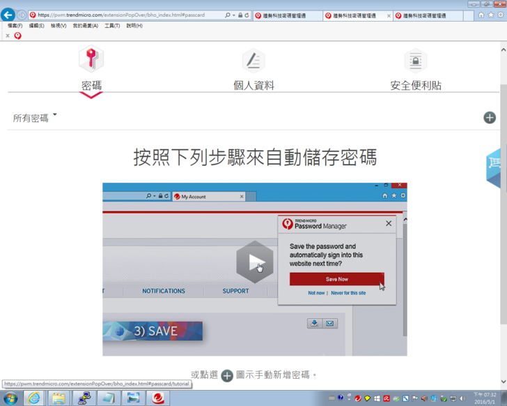 【▼】安裝完成後,之後進入密碼管理通的設定介面就如下圖所示,有自動儲存密碼的影片教學、個人資料的修改與將您的重要資訊進行加密保護的安全便利貼。