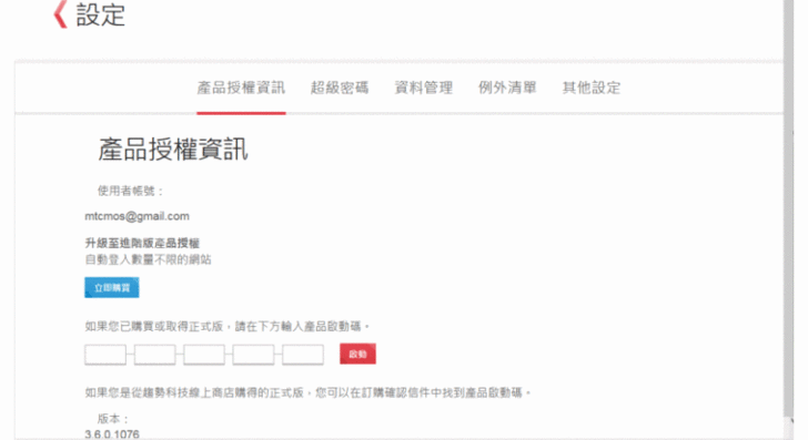 【▼】密碼管理通的設定中有產品授權資訊、超級密碼的驗證時間、資料密碼的匯入與匯出、例外清單(不記錄密碼的網站)與自動登入的選項。