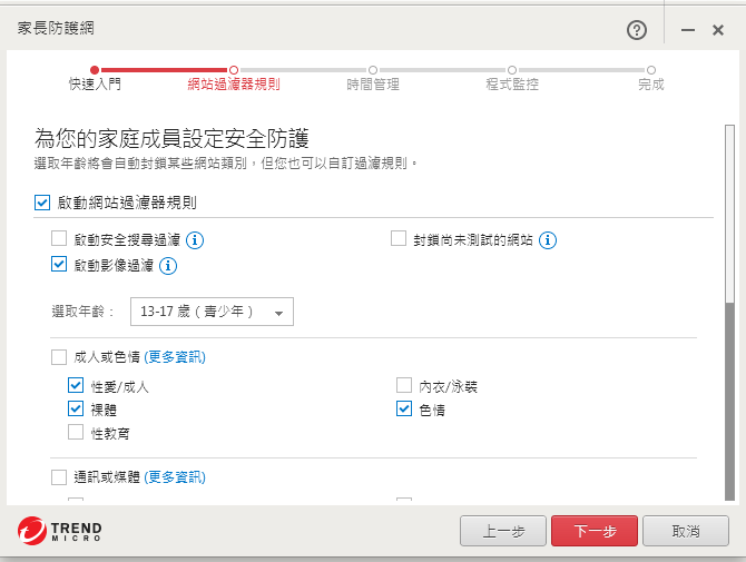 【▼】首先是網站過濾器的部分,可以先從孩子的年齡下手,設定年齡有3-7(兒童)、8-12(少年)、13-17(青少年),超過18我想應該就要對自己負責的歲數了。此外關鍵字的限制則有成人或色情、通訊或媒體、具爭議性、購物與娛樂等分類。