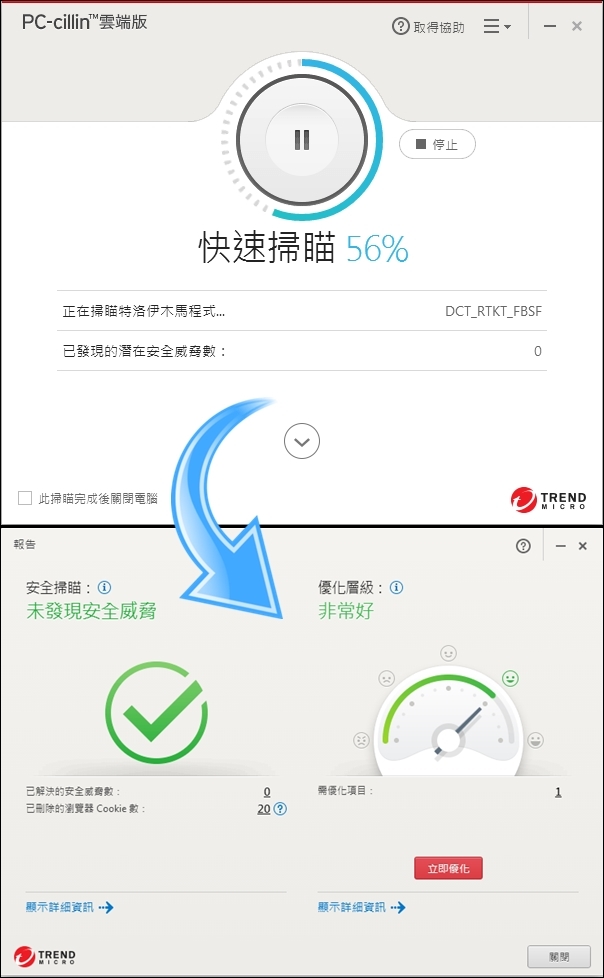 【▼】最後來個全機快速掃描,未發現安全威脅,優化等級相當好啊!