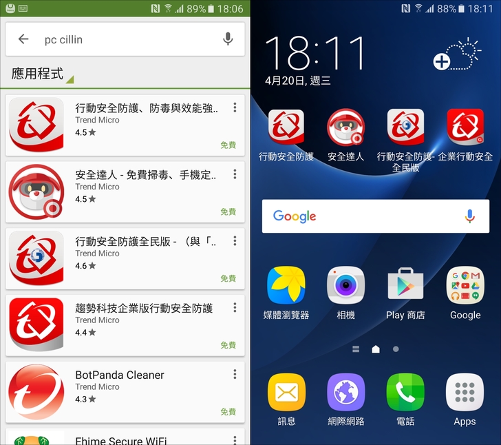 【▼】在行動裝置的安全上面,趨勢科技也不勝餘力的積極佈局,小編以Android裝置來示範,打上PC-cillin就有五個App可供下載,當然小編都要全部下載來試一試,最後確認行動安全防護與安全達人是最新的版本,其餘像全民版、企業版都是屬於較舊版本或是藥序號的。