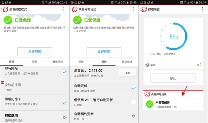 【▼】首先病毒掃描,小編建議先進行病毒碼的更新,確定更新到當天日期後,再進行即時掃描,畢竟現在一天都產生上百隻的變種病毒,只有更新再更新,才能彌補Android系統本身的漏洞瑕疵。