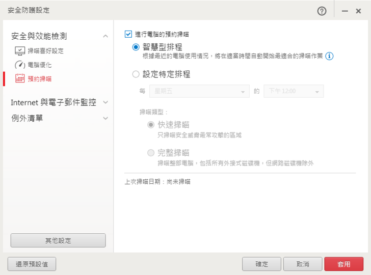 【▼】預約掃描就是大家常說的排程掃描,一般以時間來預排,不過PC-cillin 2016雲端版有依電腦使用狀況(電腦閒置時)來智慧排程掃描,算是相當貼心且有效率。