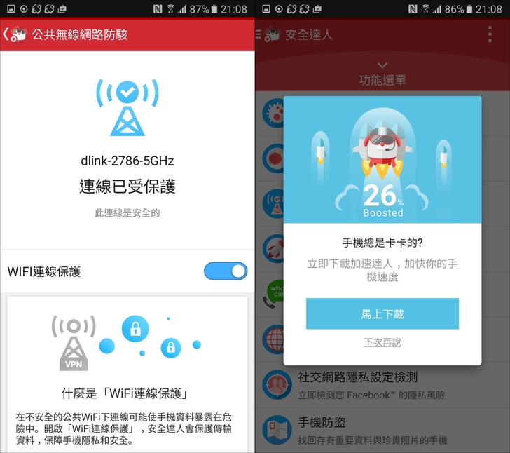 【▼】在公共無線網路防駭功能中,安全達人會保護傳輸資料,保障手機隱私與安全不外洩;而App加速則是要另外下載自家另一套App加速達人,並沒有整合在一起。