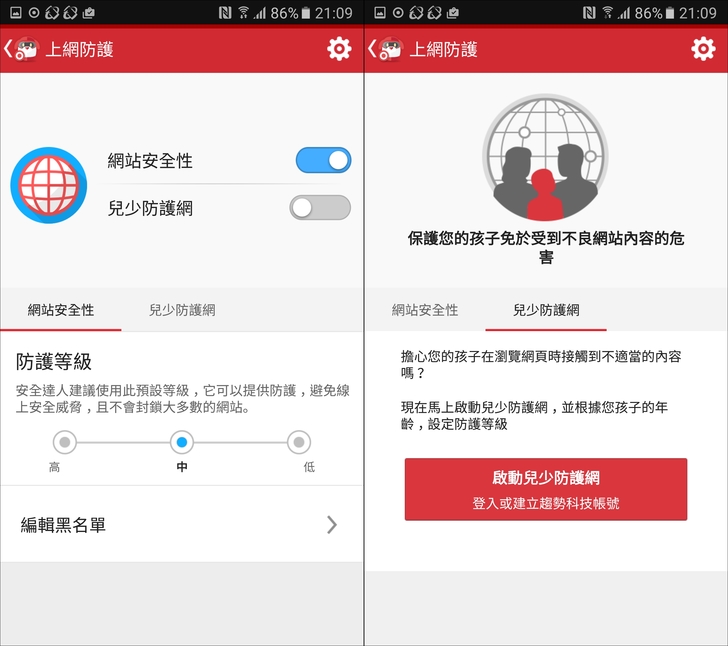 【▼】上網防護可依照防護等級作調整,建議選擇預設的中階等級,不會封鎖大部分的網站。兒少防護網能依年齡自動設定防護等級,使用前需先有一個趨勢帳號,登入後才能開啟該功能。