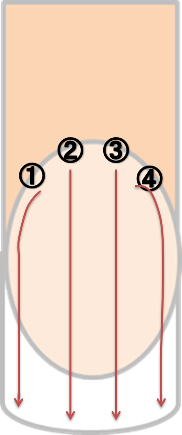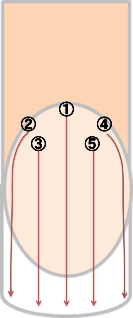 第1筆先刷中間,第2、3筆刷左右最旁邊,第4、5筆刷正中間和最旁邊的位置。