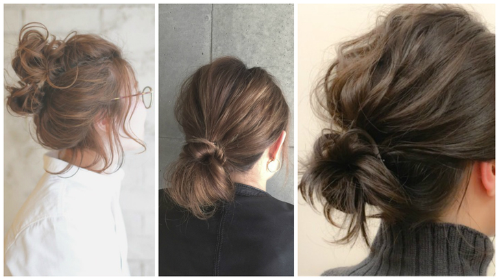 低包包頭給人一種冷靜沉著的氣質。先綁成馬尾之後,再從馬尾裡抓出一小撮頭髮繞一圈以用來遮住橡皮筋。
