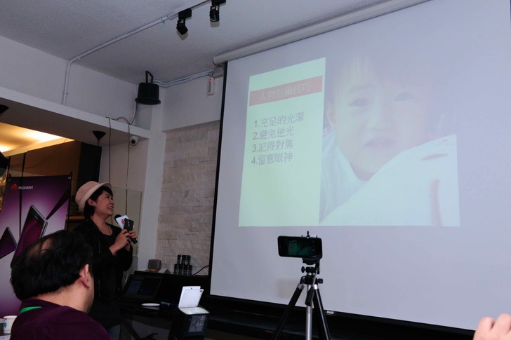 原來是手機拍照棒棒女覺得單眼要調來調去,按鍵錯綜複雜、鏡頭多又笨重,要上手不易,所以選擇用手機來表達自己作品的意境。她毫不吝嗇地分享了自己的手機拍攝的要訣,都是在日常生活中常見的,令我最印象深刻的莫過於人物拍攝,因為跟夜景拍攝很不一樣的是,後者可靠單眼大光圈大感光元件的方式克服,但人物神韻一不對,整張照片就很奇怪。所幸她分享了人物拍攝四個技巧:1. 充足光源,2. 避免逆光,3. 記得對焦,4. 留意眼神,不只是為手機,這根本是為想拍好人物照的同仁而設計的課程呀!實用度非常高。