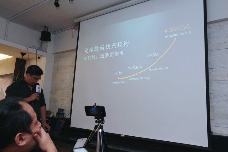第二的痛點:續航不足,針對此部分,Mate 9系列手機配備了4000mAh,是旗艦機中電量螢幕比值算大的。亦配備了快速充電的功能,而要提高快速充電效率(功率),能從提高電壓及電流方式實現,有別於Qualcomm的Quick charge(QC 3.0)方式提高電壓電流的方式,華為在超級快充方案是維持一樣電壓(4.5~5V),大幅提高電流(~4.5A)來達到最大22.5W的充電功率,因提高電壓容易造成充電過程中的發熱量,也加速電池老化的可能,所以單純用提高電流的方法來提升充電效率較為實際。市面上OPPO的VOOC閃充亦用此方法,但其接口仍維持使用Micro USB,且需配合特殊豆腐頭、線材才能實現,對未來升級著實不便。