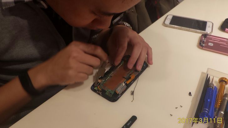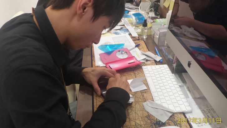 工作人員首先把手機螢幕給擦乾淨,一塵不染,再小心翼翼的把玻璃貼附著於螢幕上; 萬一有產生氣泡,他就會掀開重貼,滿搞岡的;結果當然比我這業餘玩咖貼的更美!
