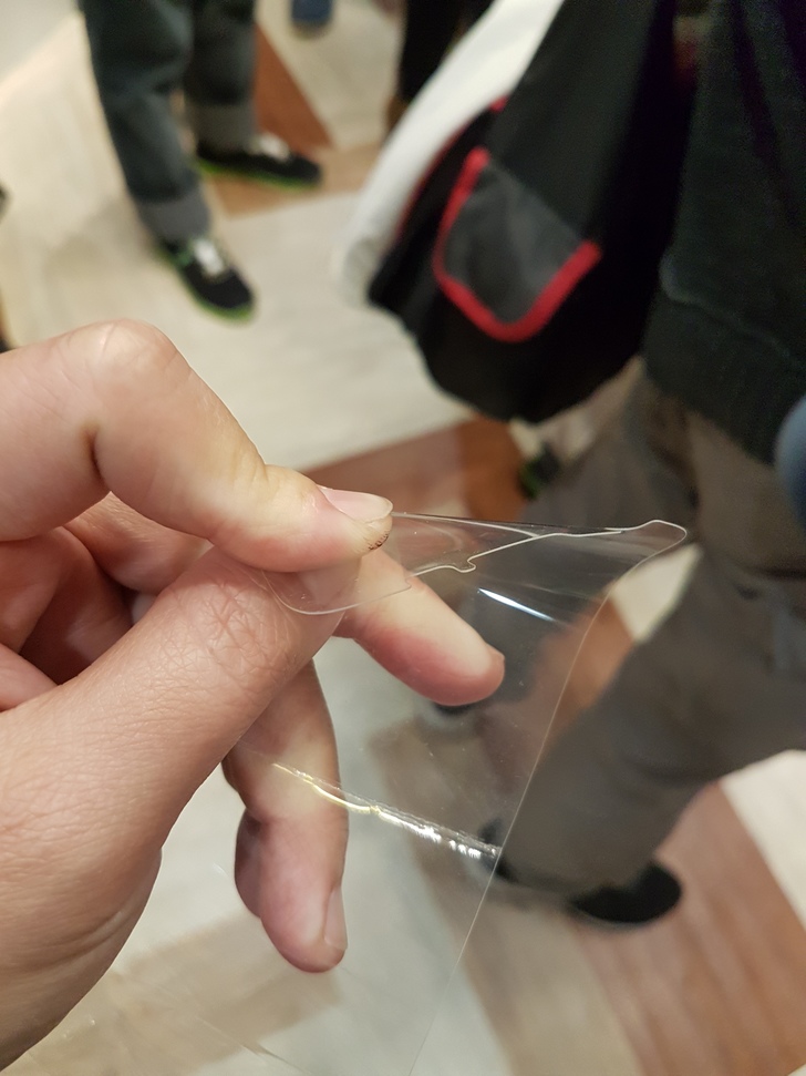 尤其現在連走路上厠所外加睡覺都機不離身,還好有有防刮的9H貼出現,完全是處理傳統貼膜老化、糊掉,幫手機表面換上“厚臉皮”可以拿筆或是放口袋和鑰匙摩擦都不怕,但玻璃。。。就怕面朝地摔傷,所以走一趟3C賣場到處都是包膜,防藍光(整個畫面黃膽),玻璃膜(使用手機別打瞌睡)。。。似乎沒有兩全其美的方式(猛換膜也是種新經濟),還好貼膜專家出了個軟玻璃,果然結合了這強項,一開始不會又退回厚版的塑膠膜框說玻璃膜,想不到店家大方拿出膜來凹破,看似塑膠膜下清楚的聽到摸到碎玻璃而且不怕立即割傷的危險,無敵了嗎?⋯⋯不但如此還有信心掛保證,只要保固內來換膜,不問原因立即更換(膜界中的好事多嗎?),根本佛心來者。