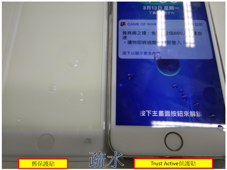 ▲下圖疏水(左方舊保護貼-呈散水狀,右邊的Trust Active保護貼則呈水滴)