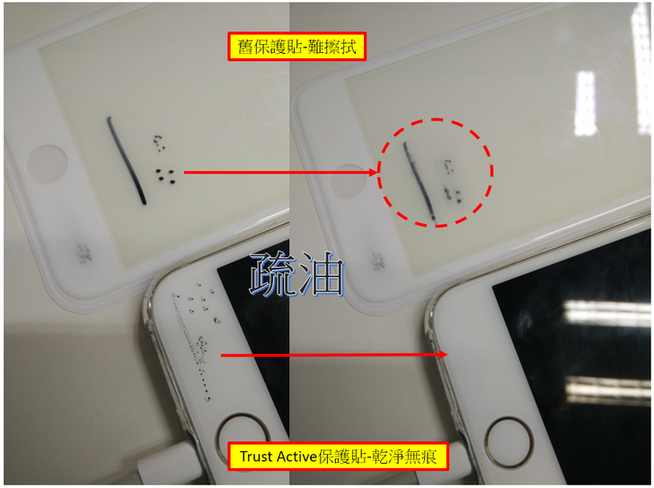 ▲疏油效果測試影片(左邊為舊保護貼,右邊為Trust Active保護貼)