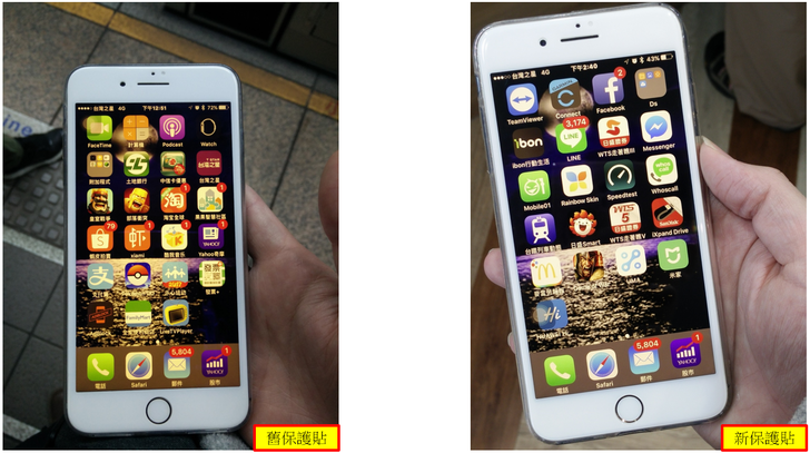 左邊為舊保護貼,使用抗藍光紫膜所以螢幕會有點黃黃,個人是可以接受。