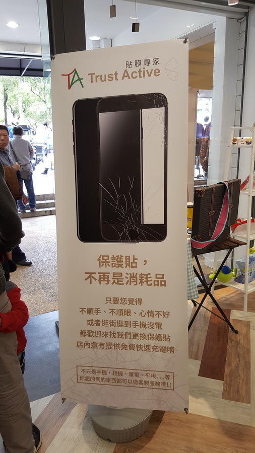 ▼ 當天網友都很快速的換上保護貼,人型立牌上面也特別註明了 Trust Active貼膜專家 門市特色。