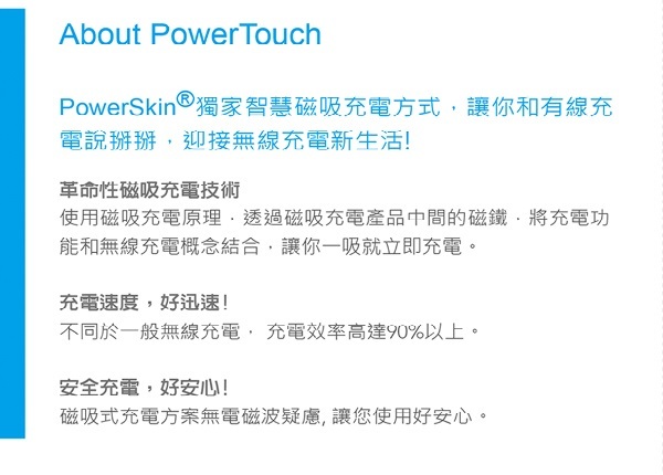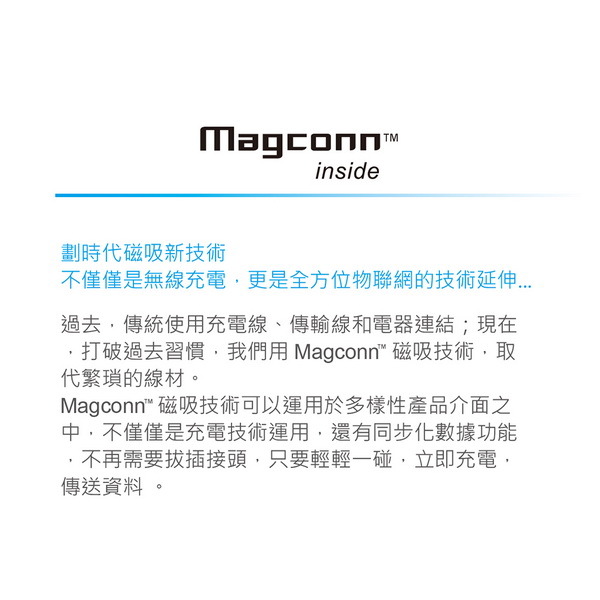這個磁吸充電的技術稱為Magconn,勁量電池利用此技術推出的產品稱為Power Touch,是2015年出現的新技術,用正負兩極相吸的磁吸原理,讓你的電子產品隨碰即充,無線充電就是如此輕鬆。 PowerTouch系列產品磁力充電不產生電磁波,安全無慮可以放心。Soundmatters本次與勁量電池合作透過強力磁吸式充電座,達到與充電線一樣的效率,將充電效率提升到高於一般無線充電的兩倍,高於90%的電力轉換率,讓你充電不但輕鬆又迅速!90分鐘就可以充飽飽,享受10小時的高品質音樂。