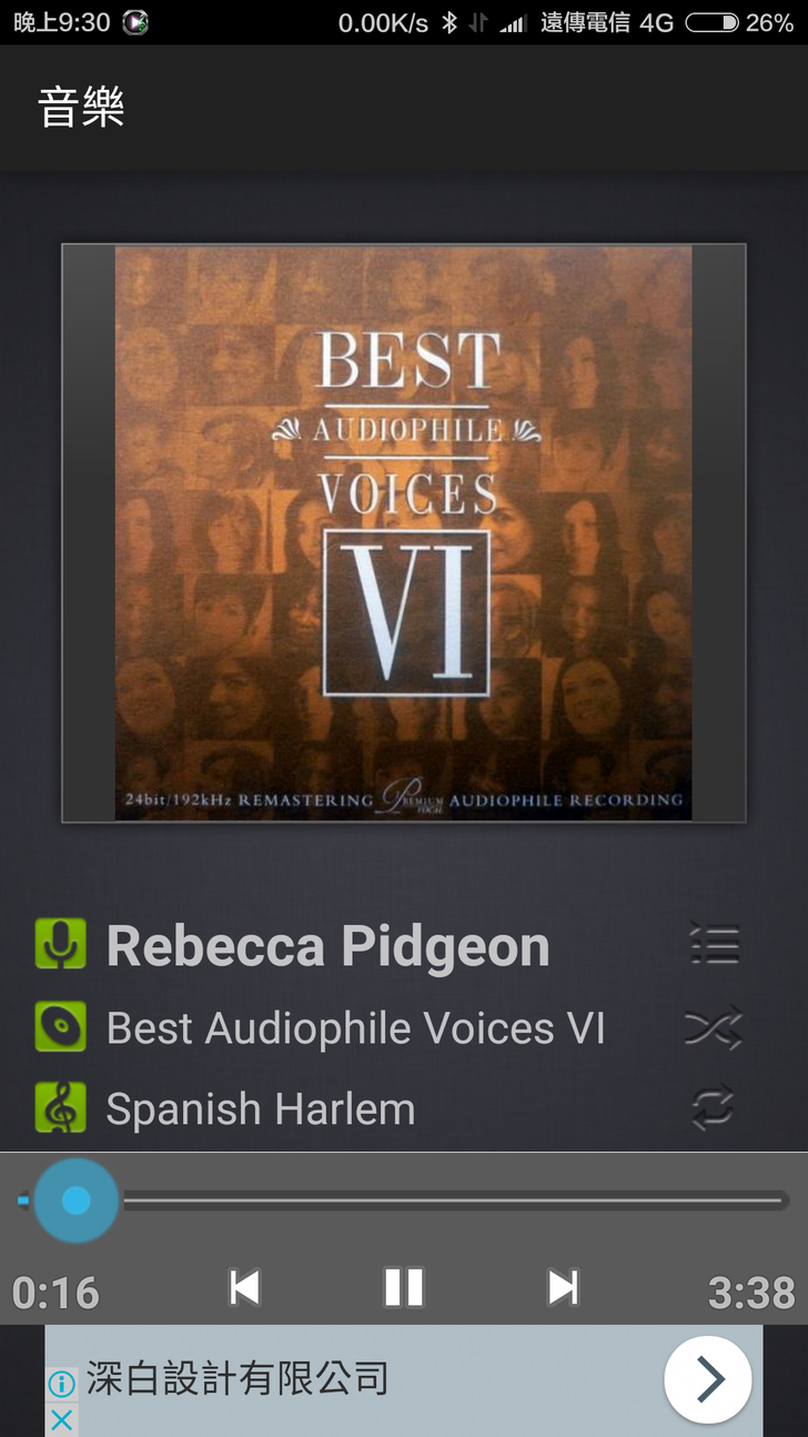 接下來讓我們認真聽一首曲子吧,我選了一首Spanish Harlem(無損音樂版),由美國的女歌手Rebecca Pidgeon(蕾貝卡•碧瑾)演唱。收錄在專輯The Raven裡,1994年發行。本專輯被認為是“高解析技術"(High Resolution Technology)的最佳錄音典範。曲子悠美,支支澄淨剔透,定位準確。中、高頻脆亮,低頻深沈,人聲輕亮。