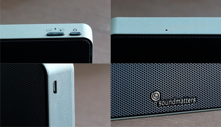上方右側是電源開關與音量按鈕。上方中間有一個小洞可能是Reset孔,要回復出廠狀態,拿迴紋針插下去就對了。右方是Micro USB孔,正面下方有Soundmatters Logo。